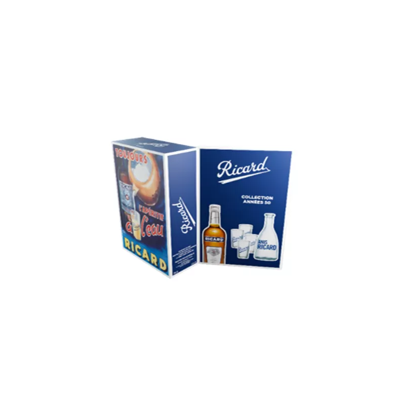 En 1932, Paul Ricard n'a que 23 ans lorsqu'il crée son Pastis de Marseille, auquel il donne son nom : ""Ricard"". Entrepreneur légendaire et audacieux, Paul Ricard donne alors à la marque une singularité qui la distingue de toute autre boisson. Créé à sa demande, le verre des années 50 porte la signature du fondateur de la marque. Cet objet a contribué, avec l’emblématique carafe ""Années 50"", à diffuser l’image de Ricard jusqu’au début des années 60. Ce coffret cadeau contient : 1 bouteille de Ricard de 70cl, 4 verres « Années 50 » et 1 carafe « Années 50 » de 50cl.