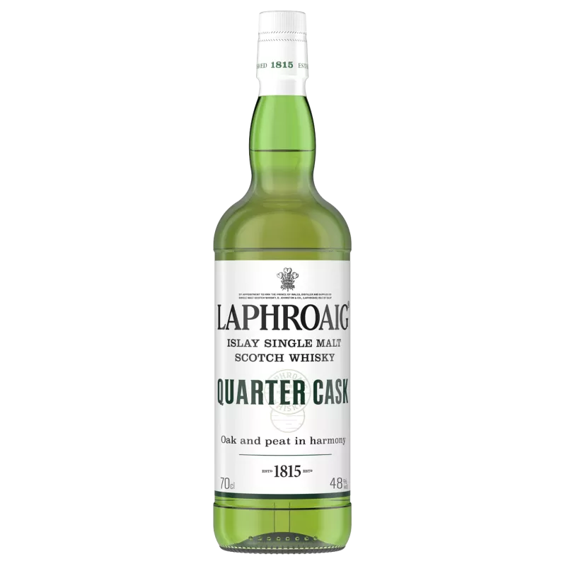 Le whisky tourbé Laphroaig Quarter Cask possède une profondeur gustative obtenue grâce à un procédé de double maturation. Sa fabrication débute de la même manière que tous les whiskies Laphroaig. L’orge maltée est d'abord fumée puis séchée sur un feu alimenté par de la tourbe découpée à la main sur l’île d’Islay. Après la fermentation, le whisky est vieilli dans des fûts de bourbon de premier remplissage en chêne américain. Lorsqu’il est encore jeune, le whisky est transvasé dans des fûts Quarter Cask, une taille beaucoup plus petite que le standard qui augmentent le contact avec le bois afin de développer des notes boisées chaleureuses et épicées. Cette méthode qui s’est presque perdue avec le temps a été rétablie pour ce Single Malt. Enfin, le distillat est mis au repos dans le chai de la distillerie situé sur les côtes de l’océan Atlantique.